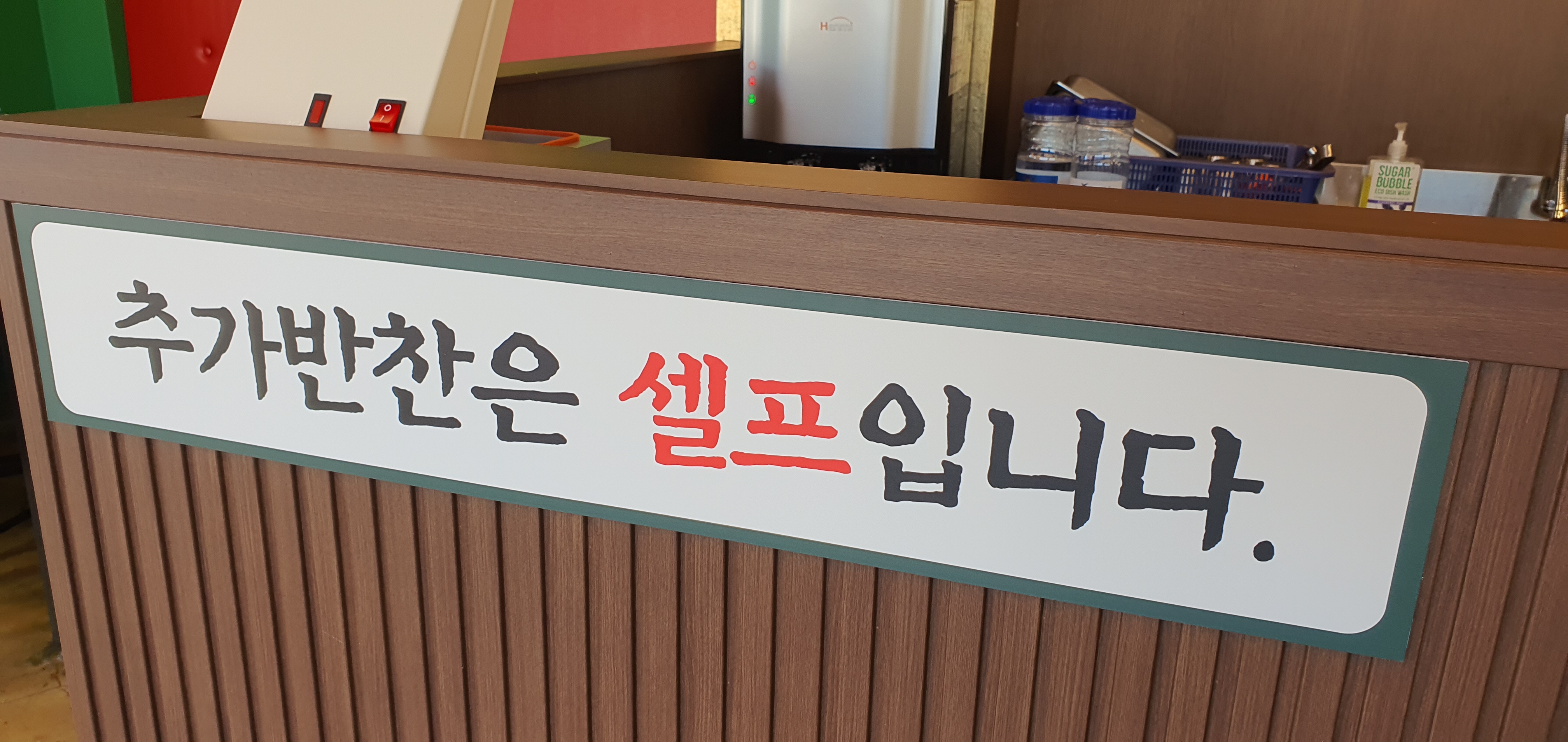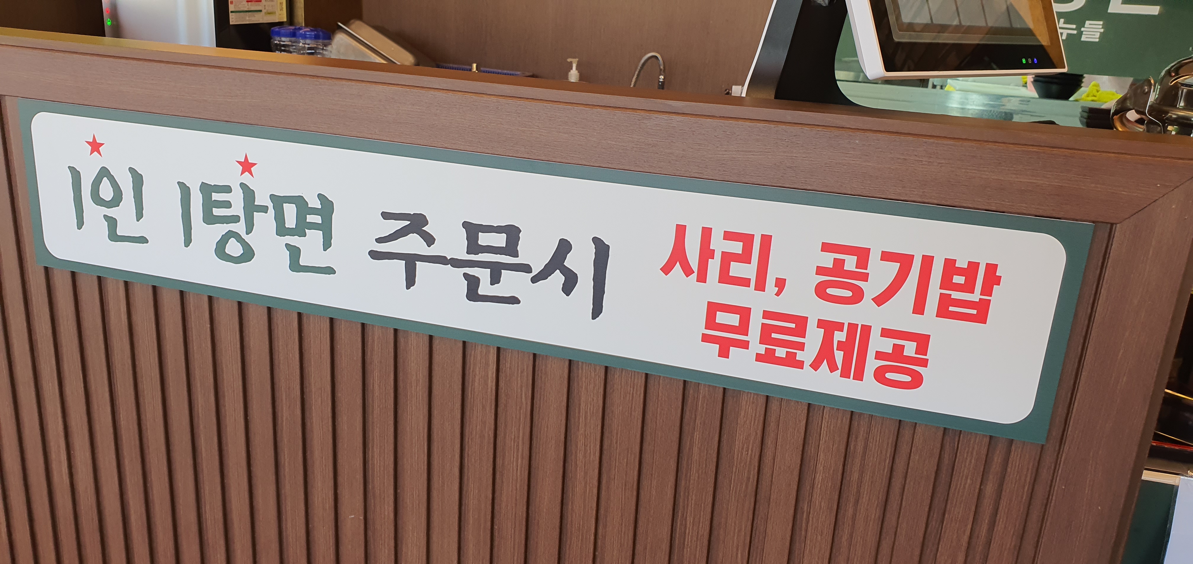 1인 1탕면 주문 시 사리와 공깃밥이 무료 제공되며, 추가 반찬의 경우 셀프입니다.