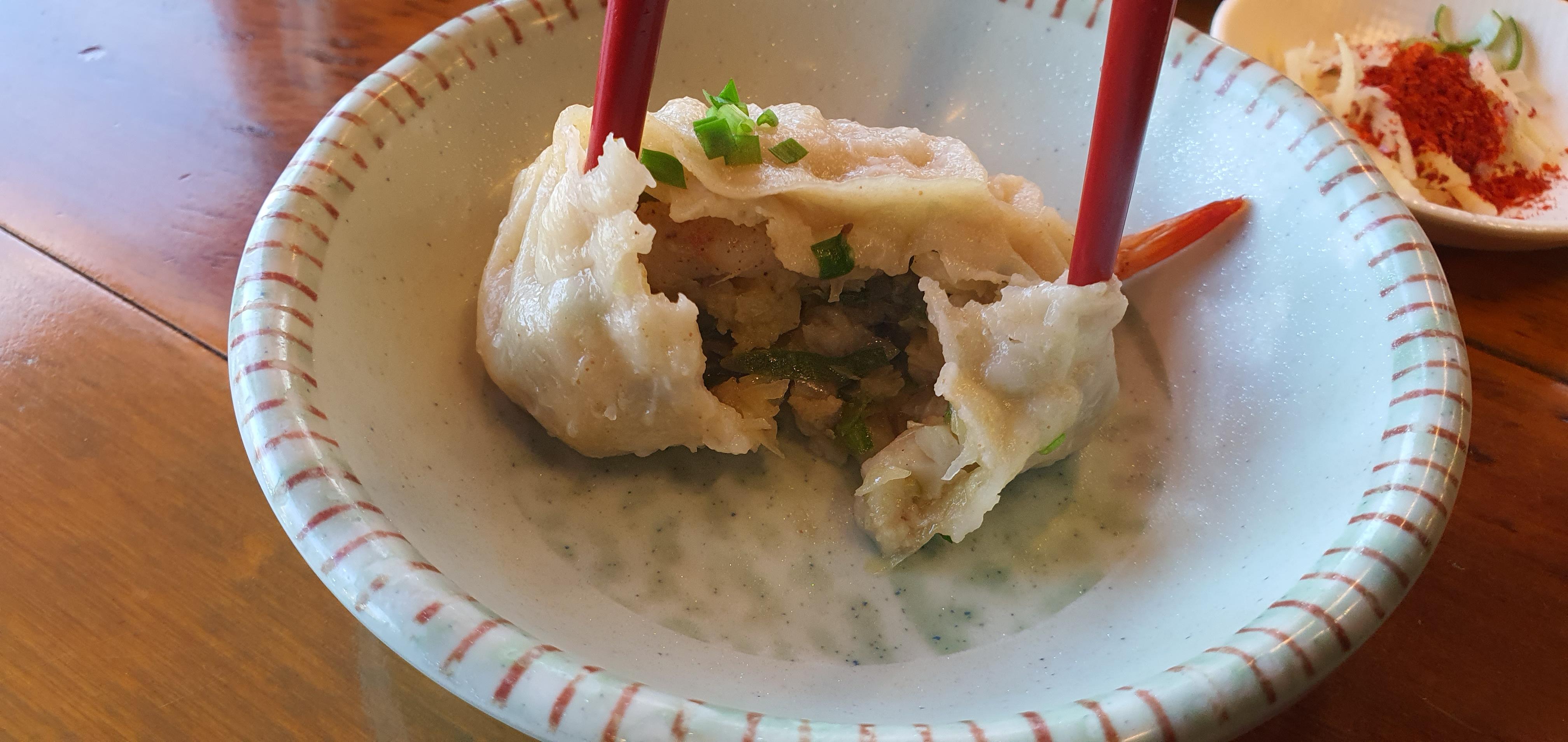 "우육탕면 니엔니엔"의 새우만두는 새우 머리를 제외한 몸통부터 꼬리 전체가 들어가 있으며, 고기반죽과 함께 만두소를 구성하고 있습니다. 샤오롱바오만큼 얇은 만두피는 아니지만 만두피도 얇은 편이며, 가족들과 방문한다면 아이들이 좋아할 만한 메뉴입니다.